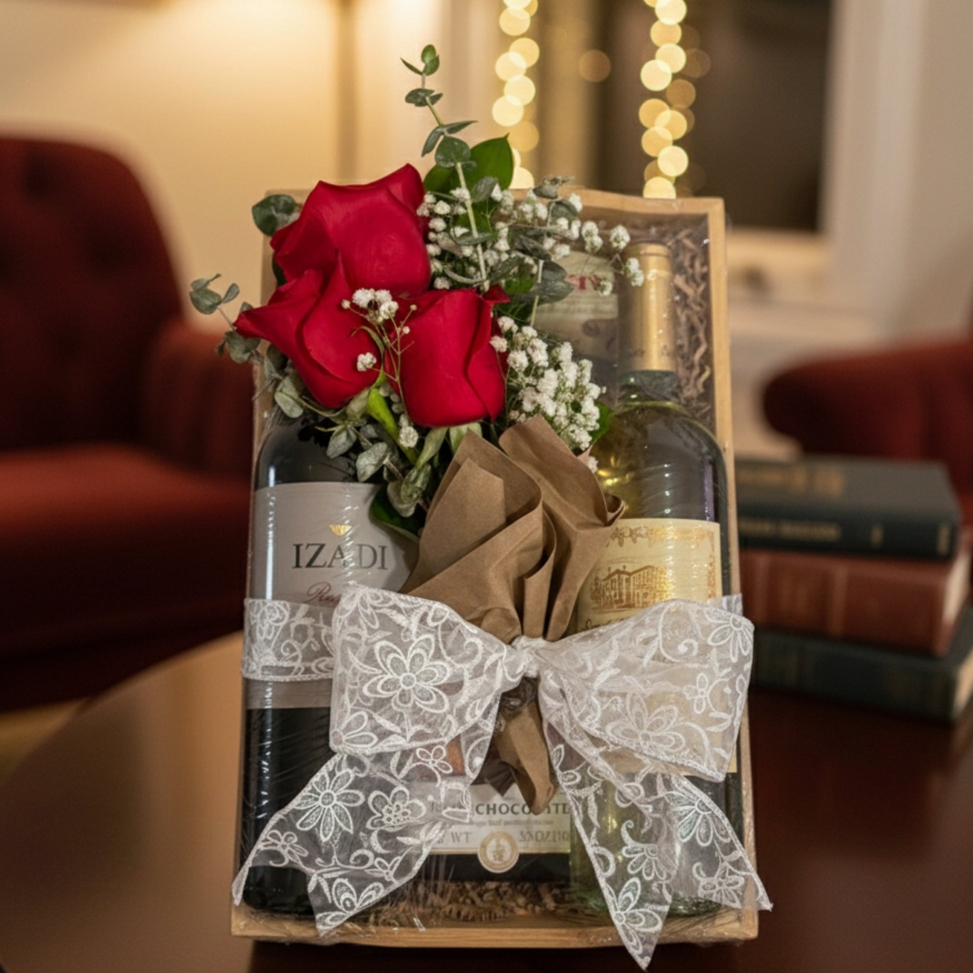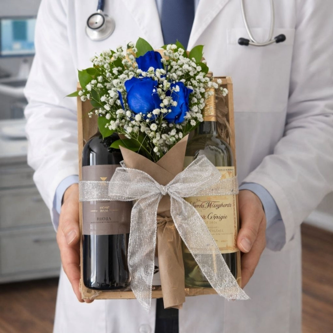 Bandeja gourmet refinada que combina dos vinos seleccionados —uno tinto y uno blanco— con barras de chocolate oscuro de alta calidad. Decorada con flores naturales y detalles elegantes, es el regalo perfecto para compartir en ocasiones especiales o sorprender con distinción en contextos personales o corporativos. Disponible para entrega en San Juan, Guaynabo, Caguas, Bayamón, Dorado, Trujillo Alto, Aguas Buenas, Carolina o cualquier parte de Puerto Rico.