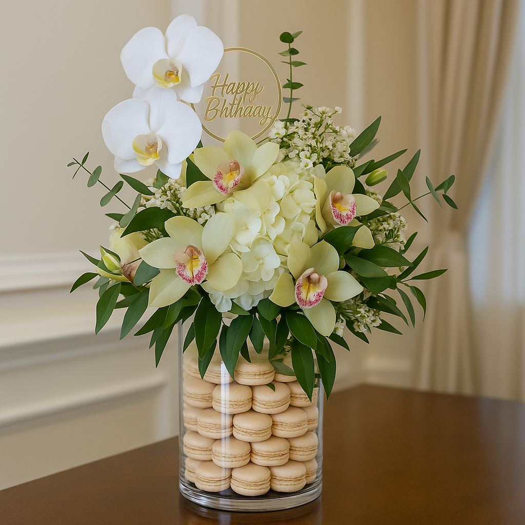 Macaron Bloom Celebration es un exclusivo y sofisticado arreglo floral presentado en base de cristal, que combina deliciosos macarons gourmet con rosas frescas, orquídeas, hortensias y follaje de temporada. Una explosión multisensorial de colores y sabores diseñada para celebrar momentos inolvidables con distinción. Perfecto para cumpleaños, gestos románticos o sorpresas elegantes en San Juan, Guaynabo, Caguas, Bayamón, Dorado, Trujillo Alto, Aguas Buenas, Carolina o cualquier parte de Puerto Rico.