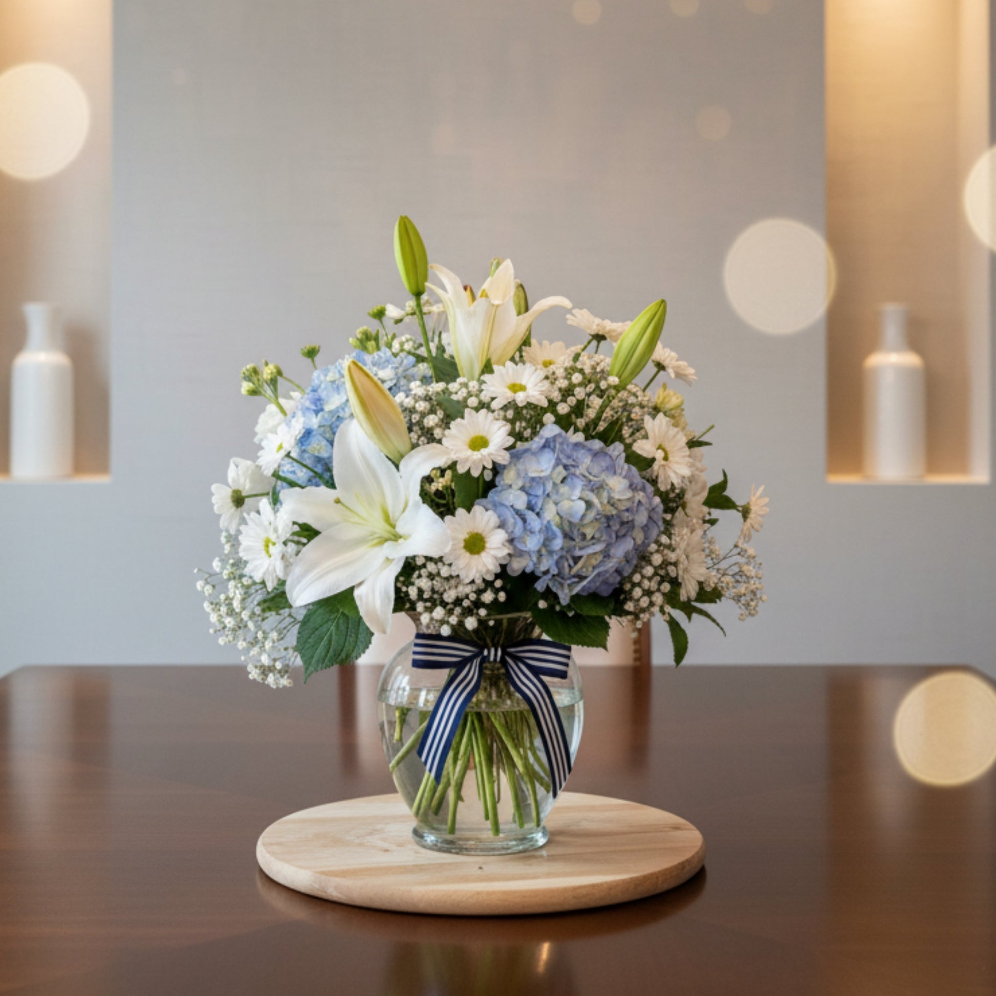 Un diseño creado para evocar paz, ternura y una presencia significativa. Zulove Aura Azul es un delicado arreglo floral con hortensias azules suaves, margaritas blancas, lirios y detalles florales que crean una atmósfera serena.