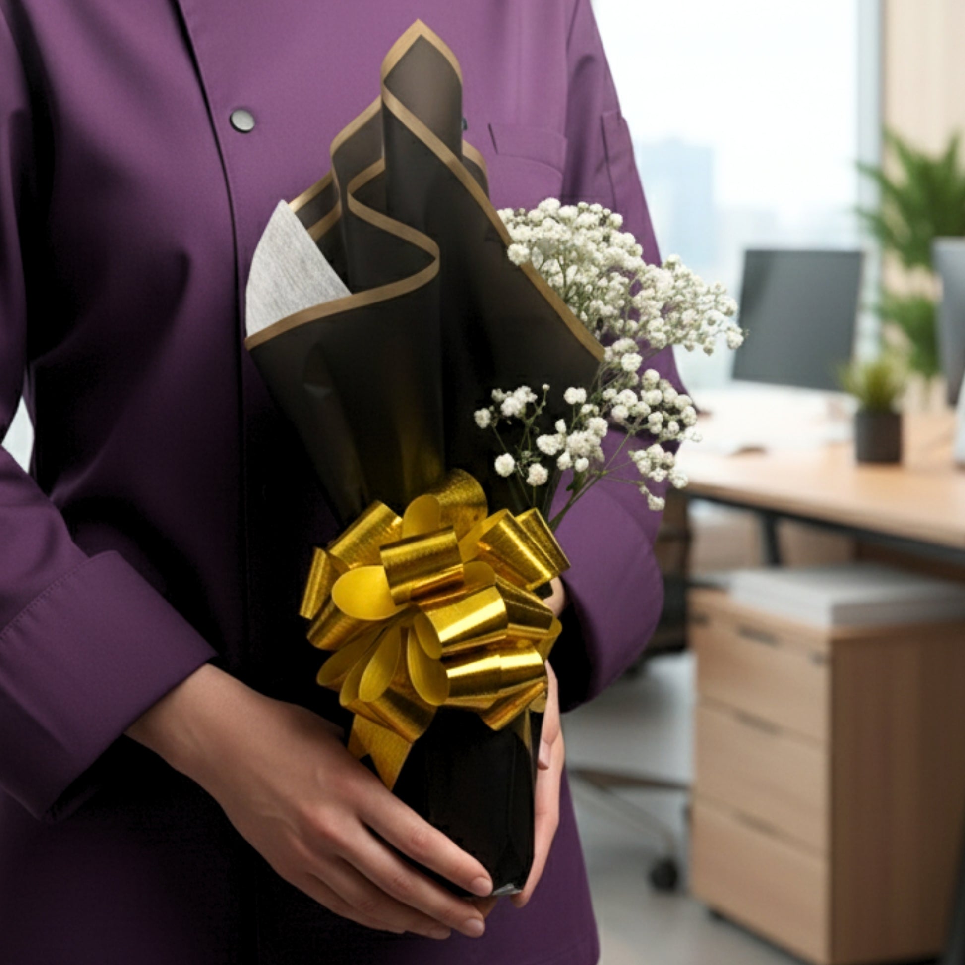 Un regalo que combina sofisticación y delicadeza. Nuestra botella de vino está envuelta en papel satinado negro, terminada con un lazo dorado y el sutil toque de gypsophila (flor de nube), símbolo de ternura y elegancia atemporal. Perfecto para celebraciones, agradecimientos, aniversarios o regalos corporativos distinguidos. Disponible para entrega en San Juan, Guaynabo, Caguas, Bayamón, Dorado, Trujillo Alto, Aguas Buenas, Carolina y zonas de Puerto Rico.