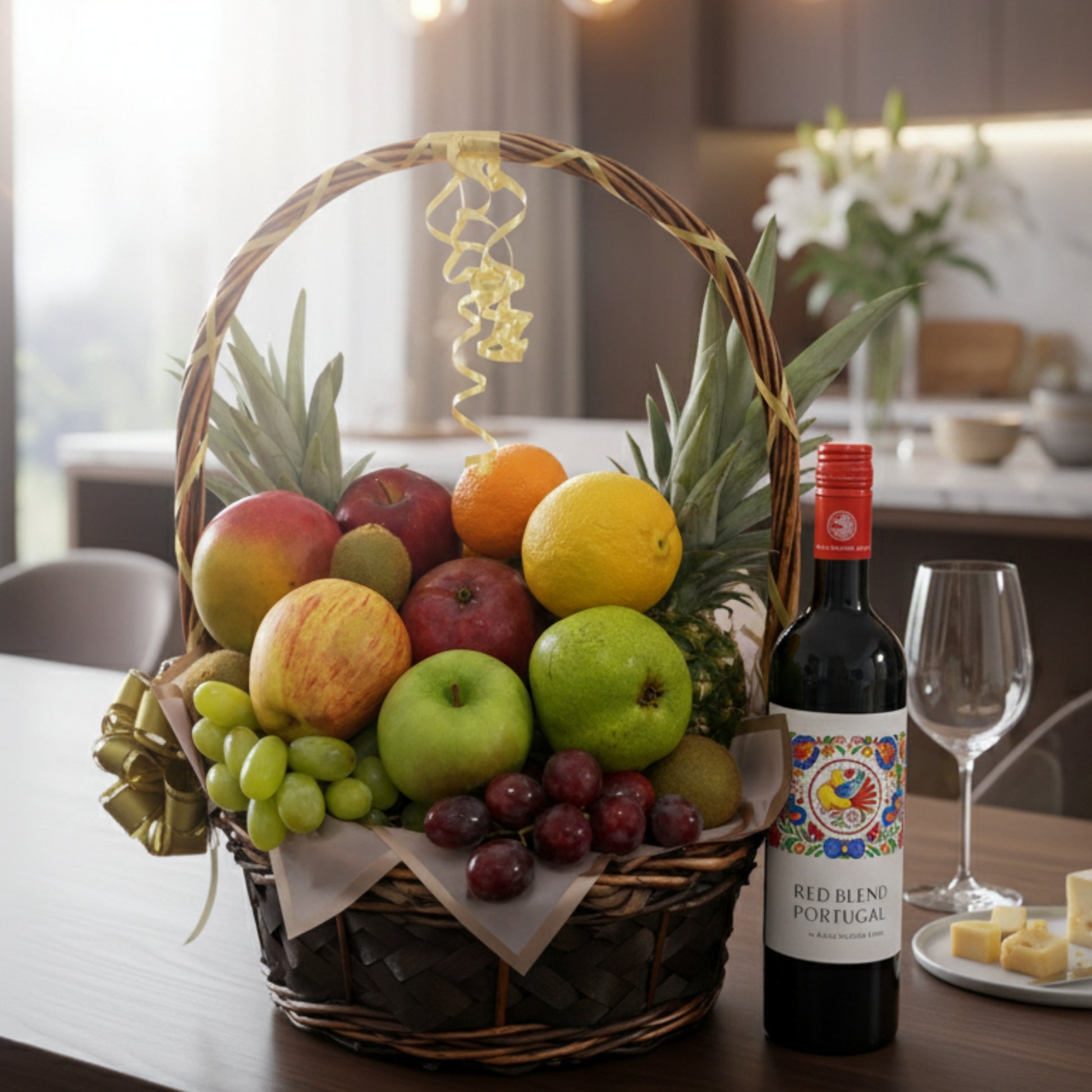 Beautiful and elegant basket featuring a selection of fresh fruits such as apples, grapes, oranges, and more. Presented with basket and ribbon, this healthy and sophisticated option is perfect for celebrations or as a thoughtful gift, leaving a memorable impression. Available for delivery in San Juan, Guaynabo, Caguas, Bayamón, Dorado, Trujillo Alto, Aguas Buenas, Carolina and throughout Puerto Rico.