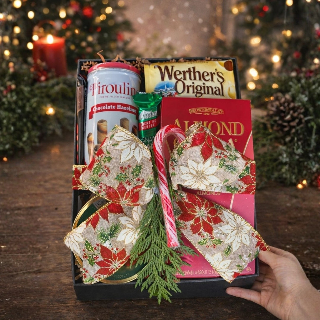 A luxurious gift box featuring gourmet delights: Roca almonds, Pirulines, hard candies, and a two rich truffle chocolate bar. Elegantly presented with a ribbon, this charming gift delivers a multisensory experience of sweetness and sophistication. Perfect for birthdays, thank-yous, or spontaneous indulgence. Available for delivery in San Juan, Guaynabo, Caguas, Bayamón, Dorado, Trujillo Alto, Aguas Buenas, Carolina and throughout Puerto Rico.