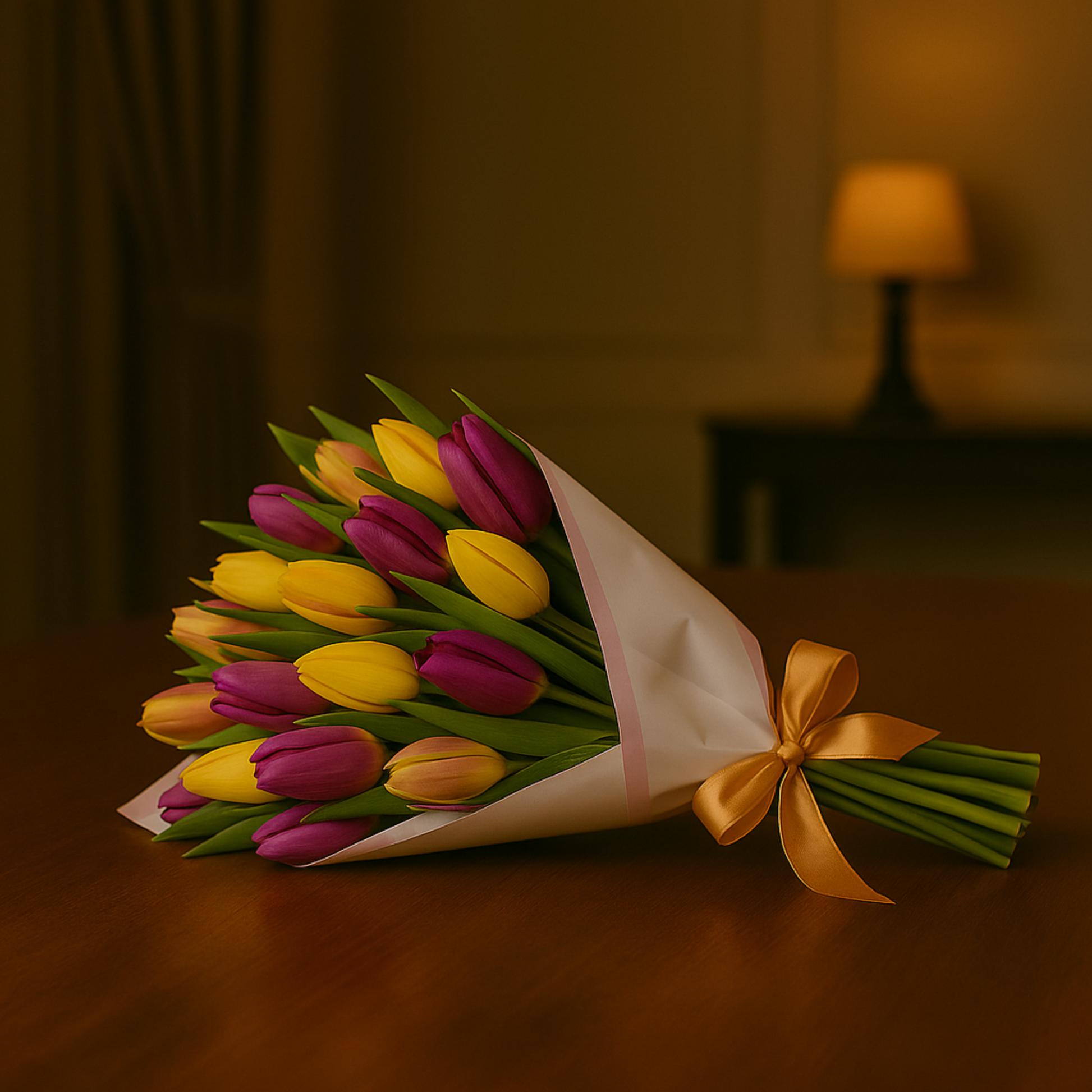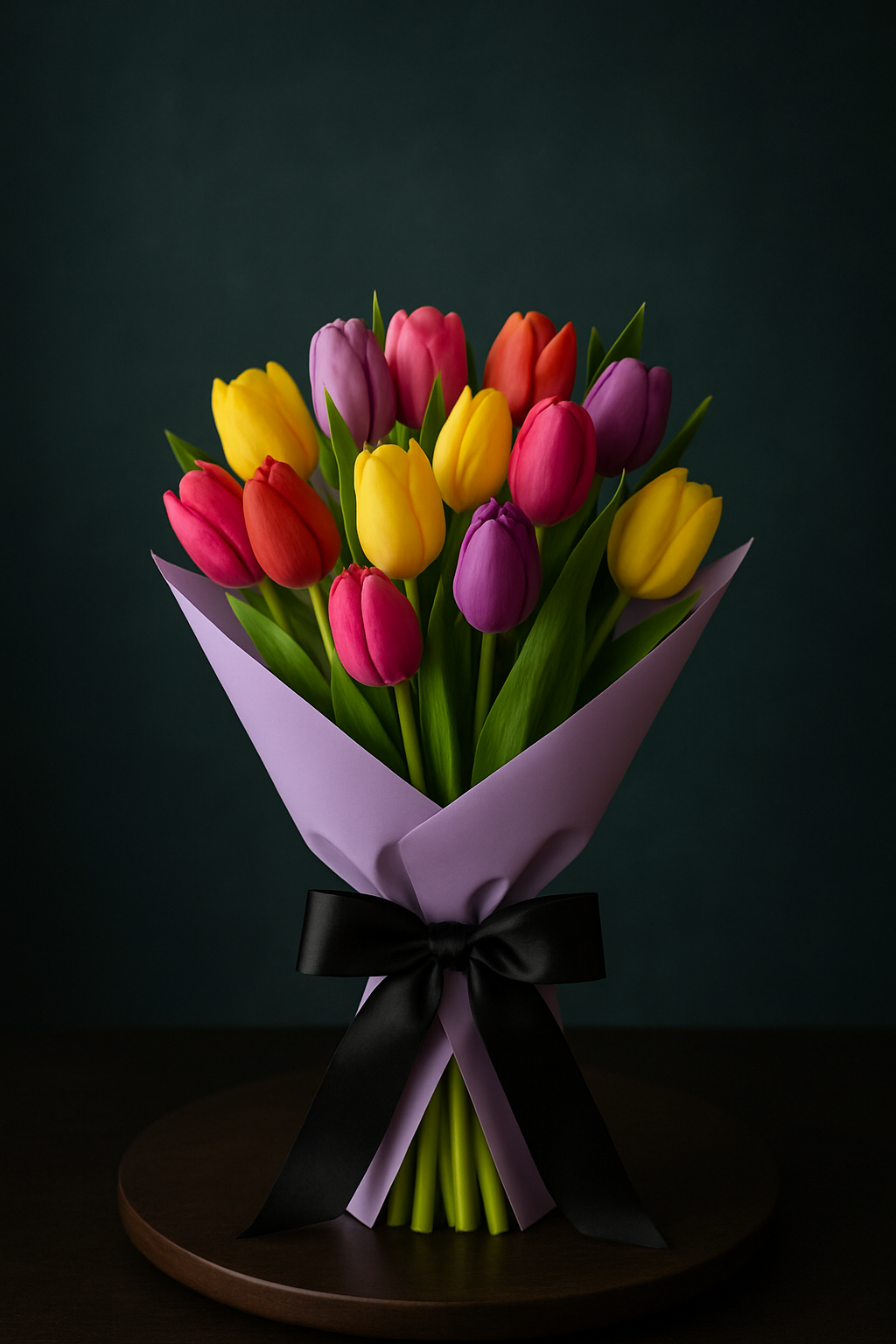 Elegant bouquet featuring selected fresh tulips, delicately wrapped in floral paper and finished with a beautiful ribbon. Colors vary according to availability, making it ideal for stylishly and simply surprising someone on any special occasion. Available for delivery in San Juan, Guaynabo, Caguas, Bayamón, Dorado, Trujillo Alto, Aguas Buenas, Carolina and throughout Puerto Rico.