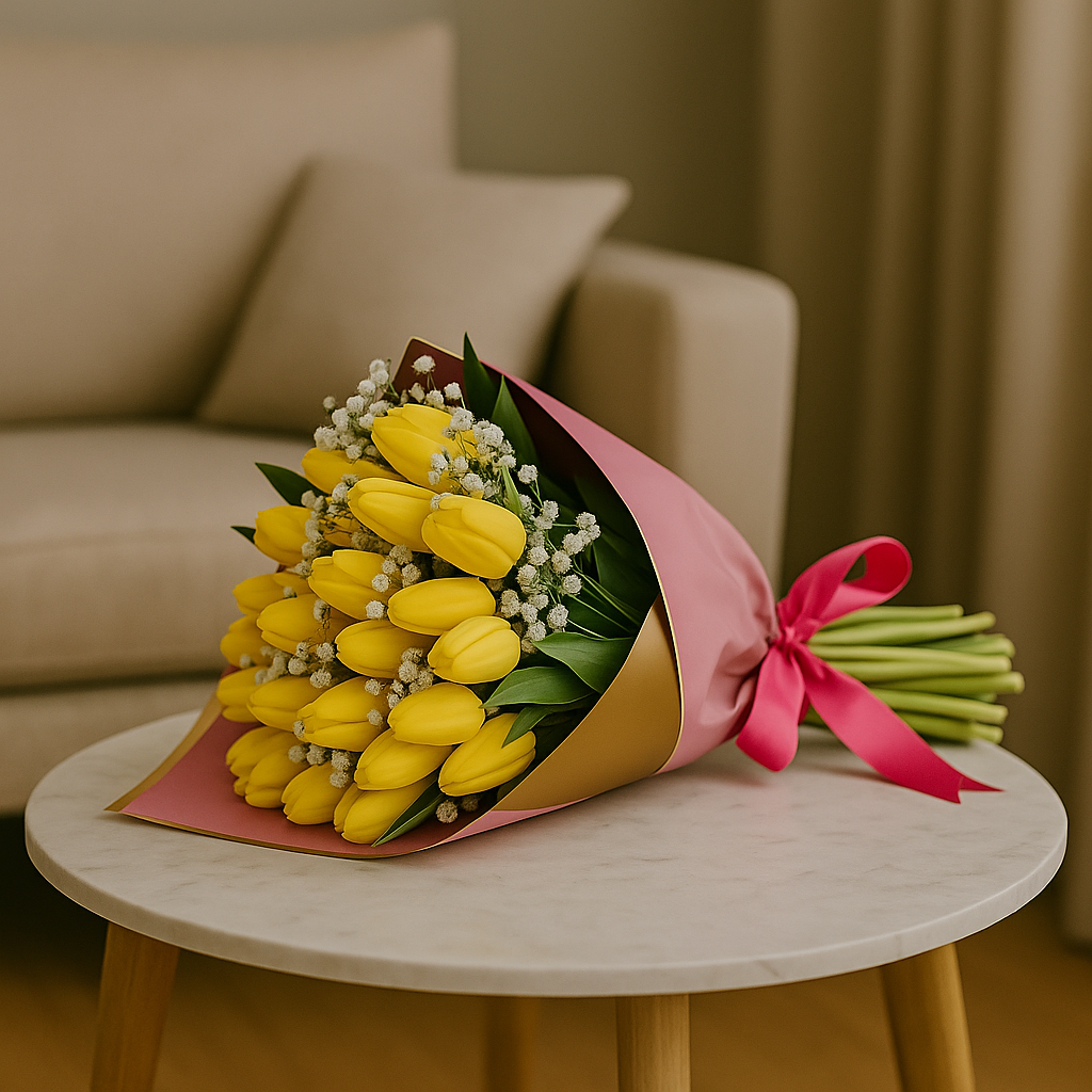 A radiant bouquet of fresh tulips paired with delicate baby’s breath, elegantly wrapped in floral paper and tied with a decorative ribbon. This design captures the essence of freshness, elegance, and joyful expression—ideal for birthdays, spontaneous surprises, or simply brightening someone's day with beauty. Ideal for delivery in San Juan, Guaynabo, Caguas, Bayamón, Dorado, Trujillo Alto, Aguas Buenas, Carolina and throughout Puerto Rico.