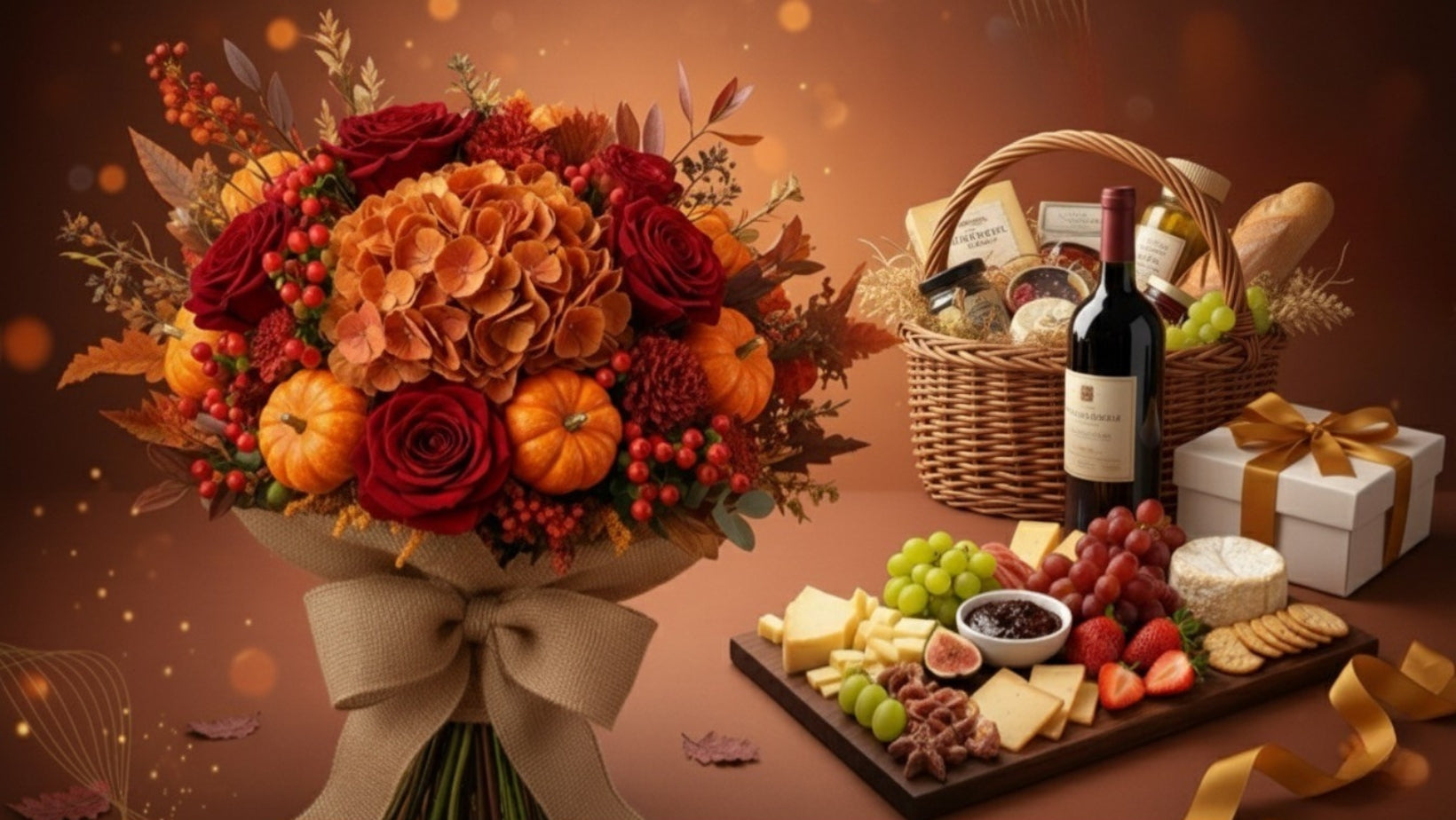 Charming Harvest – Basket with Wine, Fruits & Flowers