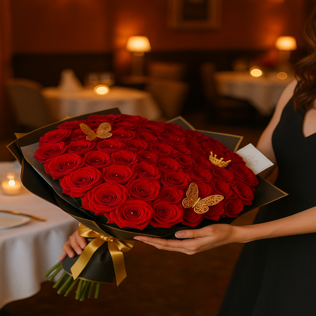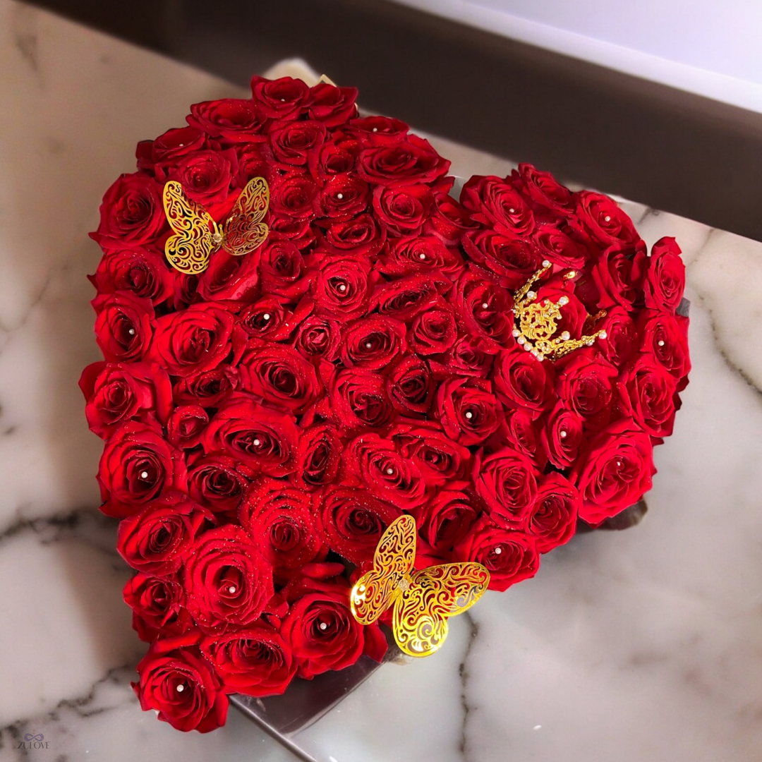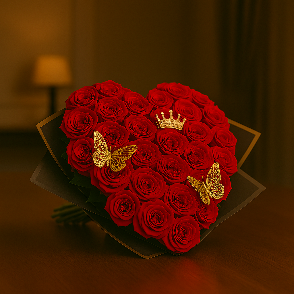 Majestuoso diseño floral compuesto por 80 a 100 rosas frescas, artísticamente dispuestas en forma de corazón. Embellecido con una mariposa simbólica y una corona, este arreglo exclusivo representa la belleza, la admiración y la realeza. Una elección impactante para celebrar el amor en ocasiones inolvidables como aniversarios, propuestas o momentos únicos en Puerto Rico. Disponible para entrega en San Juan, Guaynabo, Caguas, Bayamón, Dorado, Trujillo Alto, Aguas Buenas, Carolina y en todo Puerto Rico