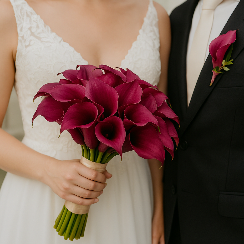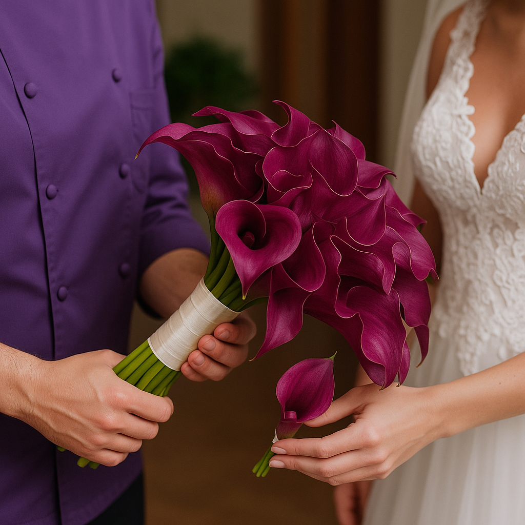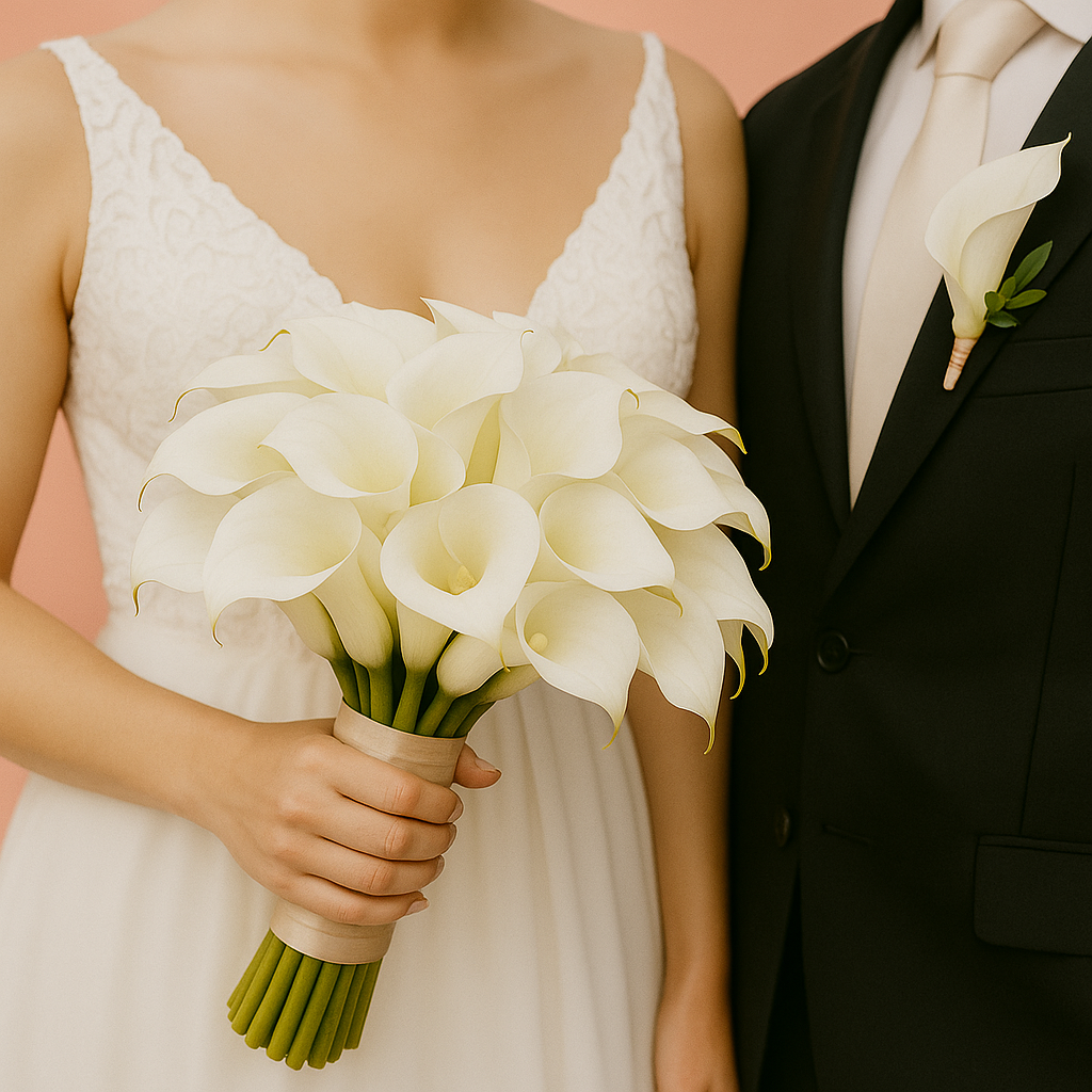 Un ramo de novia que habla por sí solo. Este diseño elegante presenta calas blancas puras, símbolo de elegancia, pureza y amor eterno. Cada flor es cuidadosamente seleccionada para crear una composición impecable, atada con cinta satinada para un acabado refinado y sofisticado. Disponible para entrega en San Juan, Guaynabo, Caguas, Bayamón, Dorado, Trujillo Alto, Aguas Buenas, Carolina o cualquier parte de Puerto Rico. Perfecto para bodas clásicas, ceremonias íntimas o sesiones fotográficas inolvidables. Un ramo atemporal para un momento único.